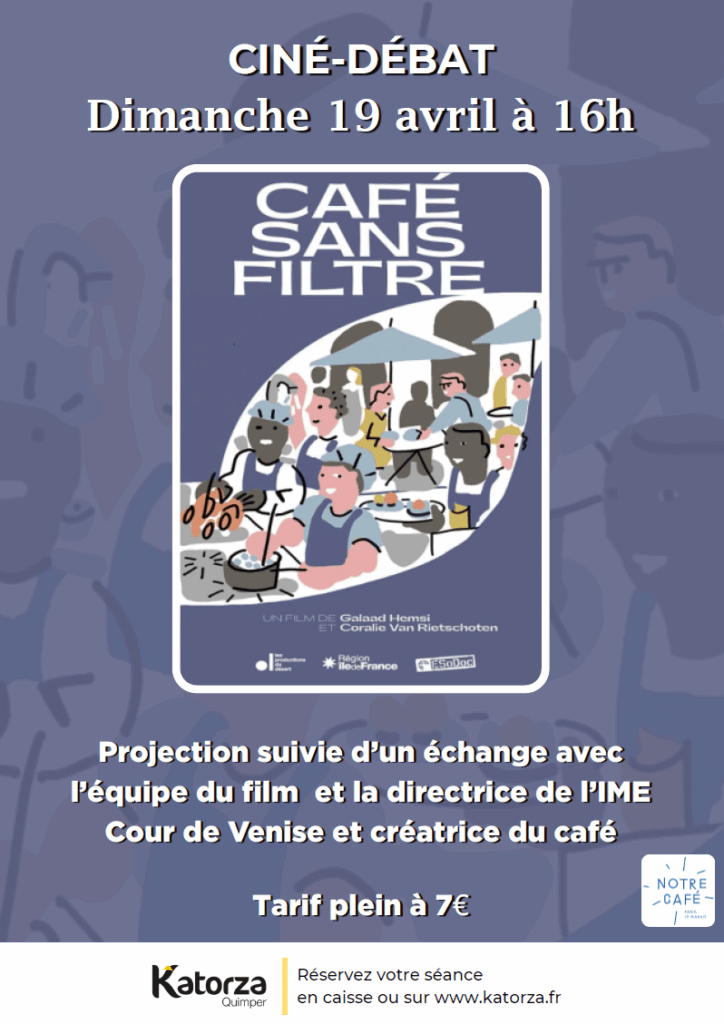 Le dimanche 19 avril 2026, à Quimper, le cinéma Katorza projettera le film « Café sans filtre ». La projection sera suivie d’un échange avec l’équipe du film, ainsi que la directrice de l’IME Cour de Venise et créatrice du café.